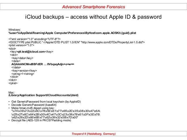iTunes/iCloud backup. Manifest.plist. Keychain data downloaded from iCloud Keychain (EPB 9.50 and lower). iCloud_Keychain.xml. Keychain data downloaded …